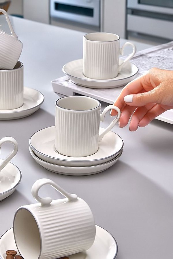 طقم فناجين قهوة مخططة فضي بتصميم خاص من كيتشن لايف ، مكون من 12 قطعة، مناسب لـ 6 أشخاص، سعة 100 مل - طقم فناجين قهوة