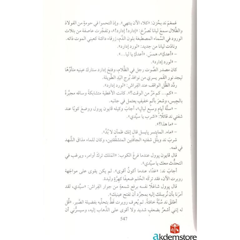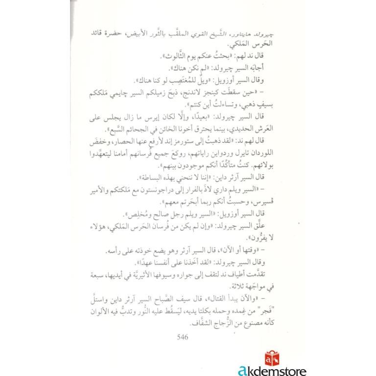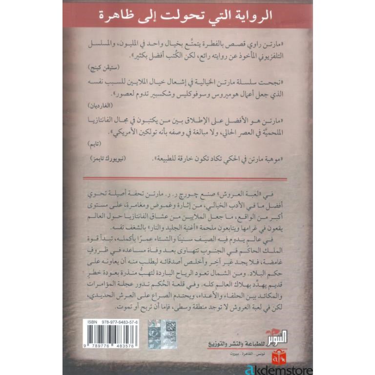 «مارتن راوي قصص بالفطرة يتمتَّع بخيال واحد في المليون، والمسلسل التلفزيوني المأخوذ عن روايته رائع، لكن الكُتب أفضل بكثير». (ستيڤن كينج) «نجحت سلسلة مارتن الخيالية في إشعال خيال الملايين للسبب نفسه الذي جعل أعمال هوميروس وسوفوكليس وشكسبير تدوم لعصور». (الغارديان) «مارتن هو الأفضل على الإطلاق بين من يكتبون في مجال الفانتازيا الملحميَّة في العصر الحالي، ولا مبالغة في وصفه بأنه تولكين الأمريكي». (تايم) «موهبة مارتن في الحكي تكاد تكون خارقة للطبيعة». (نيويورك تايمز) في «لعبة العروش» صنع چورچ ر. ر. مارتن تحفة أصيلة تحوي أفضل ما في الأدب الخيالي، من إثارة وغموض ومغامرة، على مستوى أكبر من الواقع، ما جعل الملايين من عشاق الفانتازيا حول العالم يقعون في غرامها ويتابعون ملحمة «أغنية الجليد والنار» بالشغف نفسه. في عالمٍ يدوم فيه الصيف سنينًا والشتاء عمرًا بأكمله، تبدأ قوة الملك الحاكم في الجنوب تتهاوى بعد وفاة مساعده في ظروفٍ غامضة، فلا يجد غير آخِر وأخلص أصدقائه ليطلب منه أن يعاونه على حكم البلاد. ومن الشمال تعود الرياح الباردة لتهبُّ منذرة بعودة خطرٍ قديم يهدِّد بهلاك العالم كله. وفي قلعة الحُكم تدور عجلة المؤامرات والمكائد بين الحلفاء والأعداء، ويحتدم الصراع على العرش الحديدي، لكن في لعبة العروش لا توجد منطقة وسطى، فإما أن تربح أو تموت.